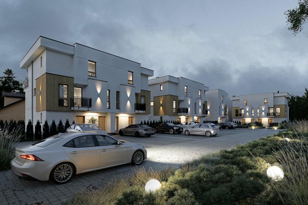 Wygodę mieszkańcom zapewniają podwójne miejsca parkingowe, do mieszkań dwupoziomowych przestronne ogródki, a do mieszkań na drugim piętrze duże tarasy.